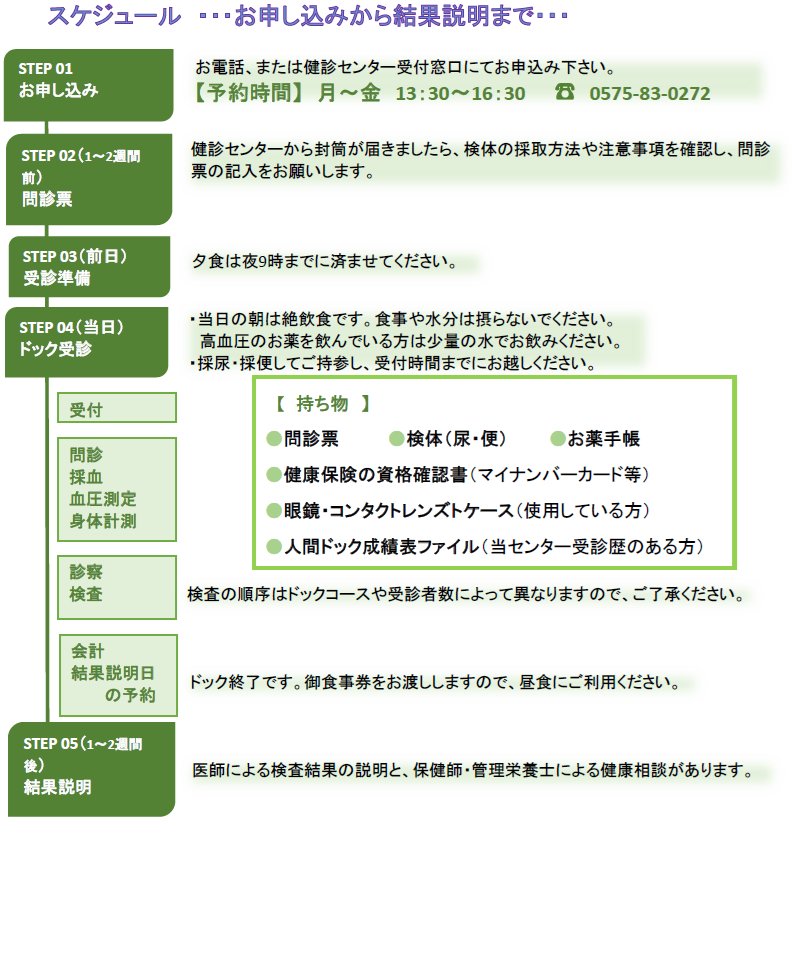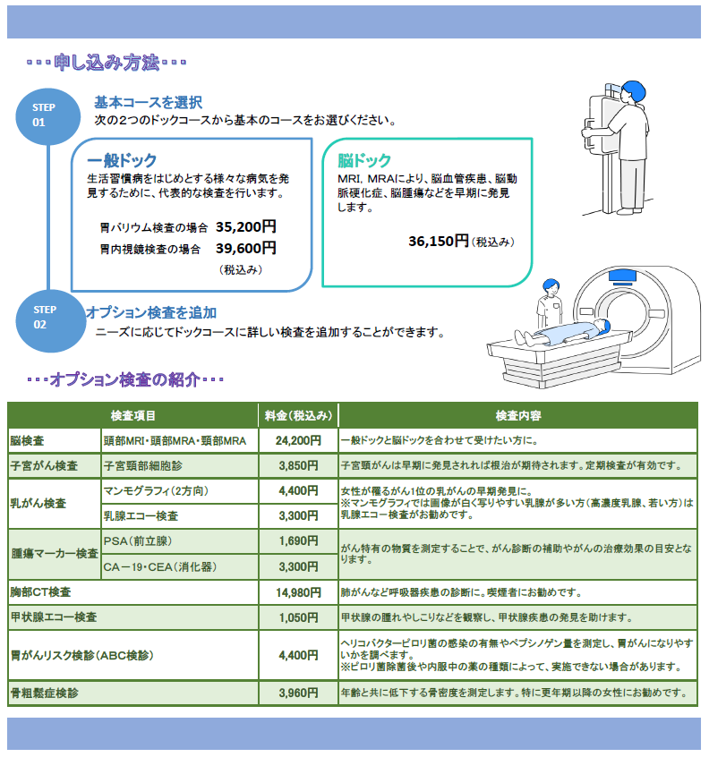 ドックは完全予約制です。来院の際もしくは電話にてお申込みをお願いします。